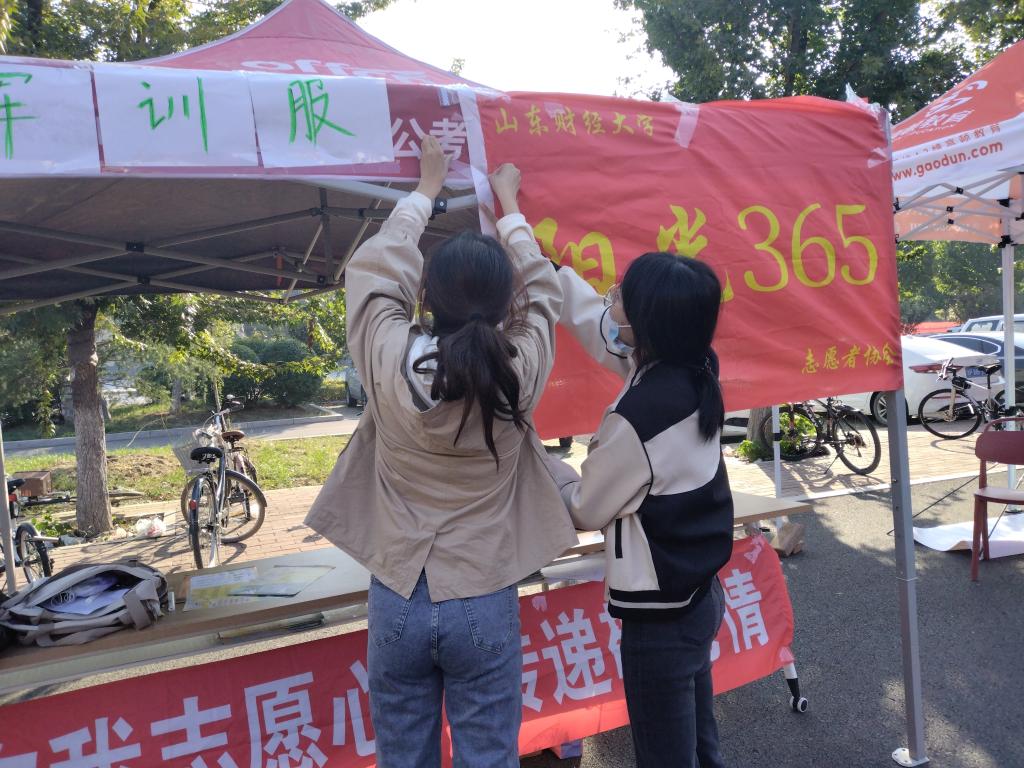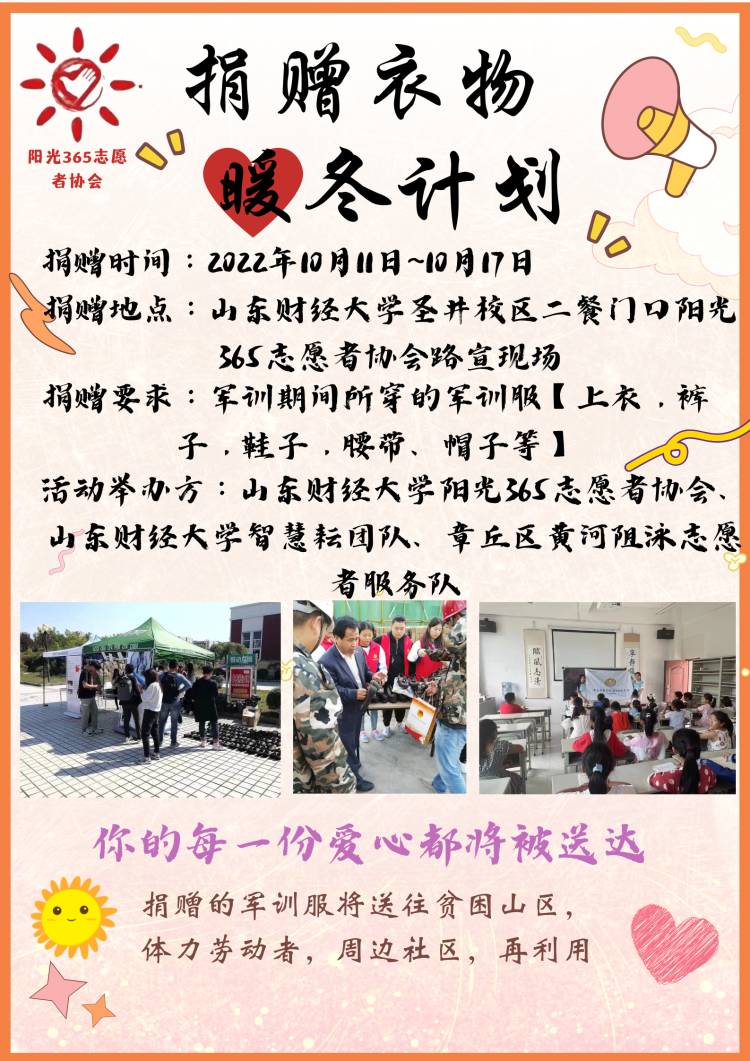 公共管理学院阳光365志愿者协会秉持“播撒阳光,与爱同行”的传统理念,与山东财经大学智慧耘团队,章丘区黄河阻游泳志愿服务队合作回收军训闲置衣物,此次活动通过路宣和扫楼相结合的方式,在向同学们宣传的同时,也克服了“社恐”,锻炼了沟通能力。此次活动的目的在于将同学们的爱心传递到村民心中,将每一套衣物温暖他人一冬。同学们献出的不仅是自己满载回忆的军训服,更是将一份份爱心无限的传递,让更多的贫困百姓感受到社会的温暖。