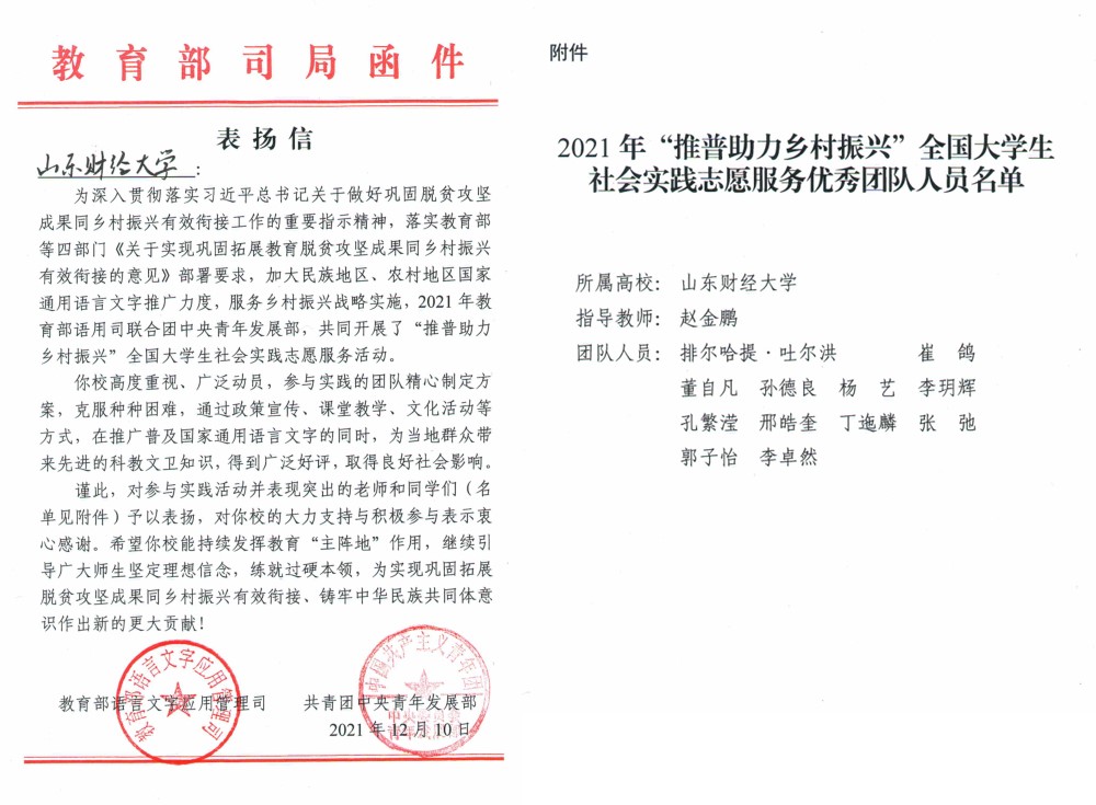 近日,教育部语言文字应用管理司和共青团中央青年发展部共同向学校发来表扬信,对我校社会实践“三千计划”“一言一行”团队提出表扬。这是我校连续两年收到教育部和团中央的表扬信。