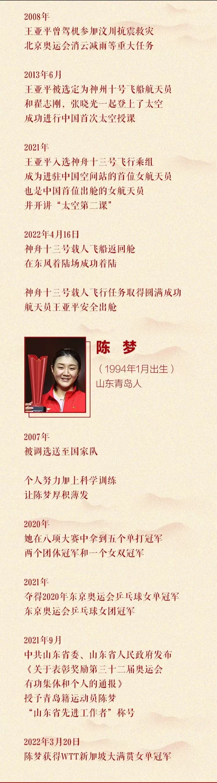 自乒乓球项目进入奥运会以来,中国选手从未让女单金牌旁落。在2021年8月举行的东京奥运会上,乒乓球女单冠军榜上又增添了一个新的名字——山东姑娘陈梦。之后的团体比赛,陈梦再接再厉,与队友联手夺得金牌,成为继李晓霞后又一位包揽奥运会女单和女团金牌的山东运动员,为山东赢得了崇高荣誉。夺冠时,陈梦激动落泪。5岁开始打乒乓球,13岁入选国家队,就在人们以为一颗新星冉冉升起时,陈梦的大赛成绩却并不理想,“性格偏软”“当不了‘一姐’”等质疑声随之而来。陈梦没有放弃,她一点一点磨炼自己,直到最后“逼”出更好的自己。