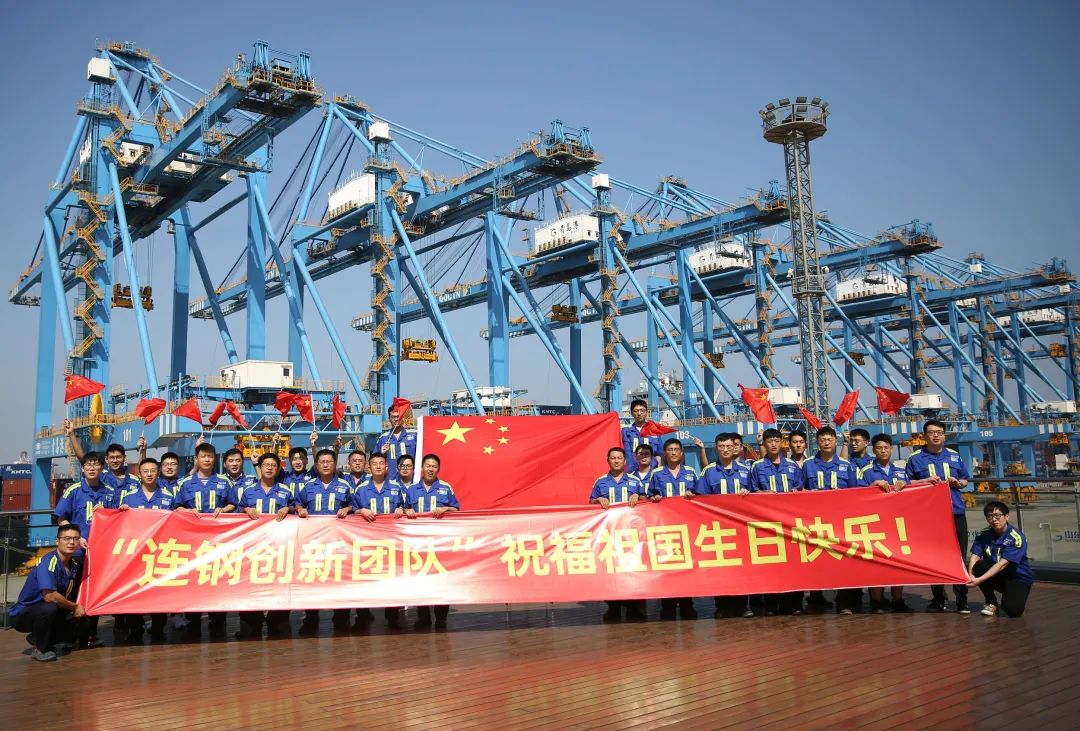 2020年9月30日,在山东自贸区青岛片区,山东港口青岛港全自动化码头“连钢创新团队”祝福祖国生日快乐(来源:视觉中国)