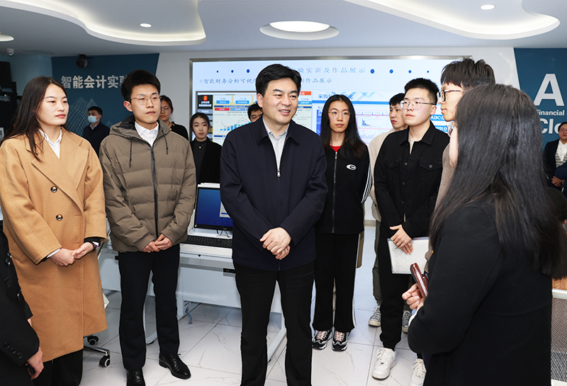 报告会后,刘天东来到会计学院智能会计实验室,参观了《智能财务分析可视化》课程实验实训作品展示,并与会计学院研究生第二党支部的青年学生们交流起学习党的二十大精神的方式方法,现场气氛活跃轻松。
