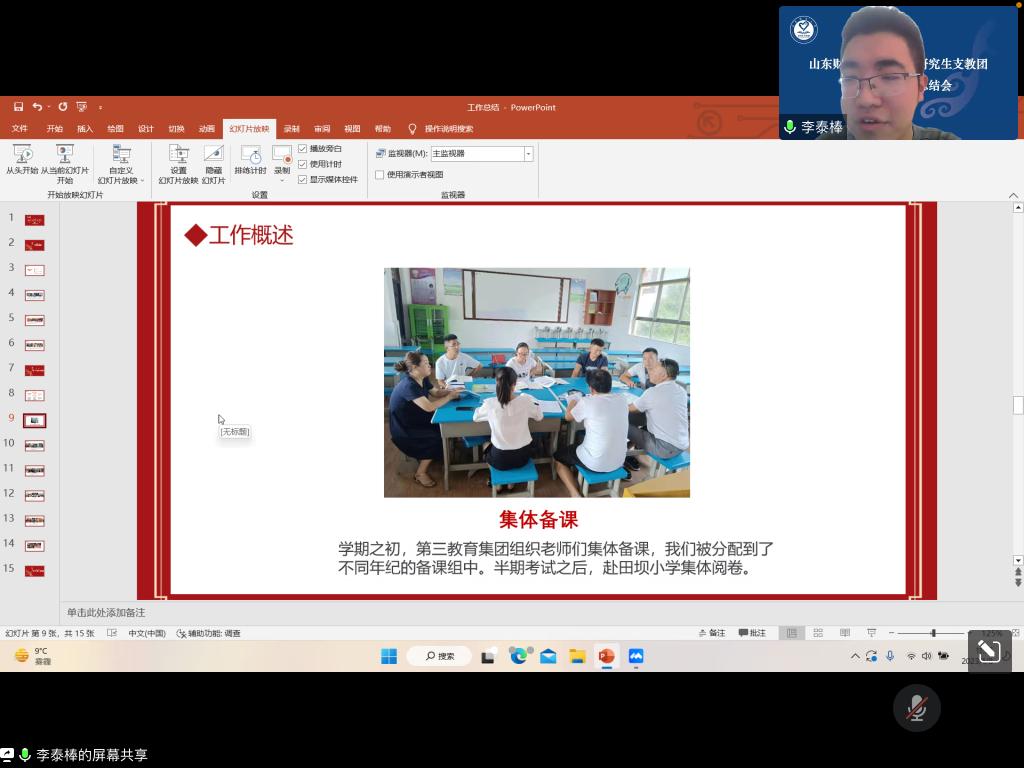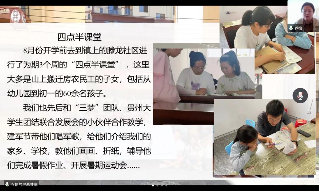 会议上,青海门源分队戴辰凯、贵州六曲分队乔怡、贵州水塘堡分队李泰棒,从支教地概况、教育德育、志愿服务和个人收获四个方面,展示了各分队的丰富成果。在支教期间,志愿者们克服了种种客观困难和身体不适,在疫情的考验下,坚守岗位,教书育人,深入一线教育教学,创新教学工作方法,不断探索提升授课水平,获得了丰硕的教育成果;以高度负责的责任感,以心换心,真情付出,通过组织丰富的课外活动,建立系统的家访制度,贴近支教学生生活,与孩子们建立深厚感情,深得学生尊敬和喜爱。志愿者们积极参与地方教育局、共青团工作,发挥大学生优势,为当地相关工作注入新的活力。疫情封控期间,志愿者们更是不畏感染风险,穿起防护服,积极投入到当地疫情防控工作中。从做好教学工作到全面赋能,24届研支团全体成员通过自己的努力,为教育扶智、乡村教育振兴贡献力量,获得服务地单位的一致好评。