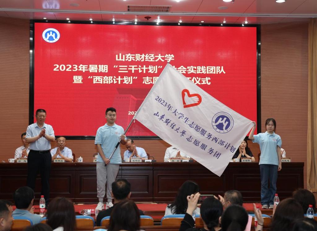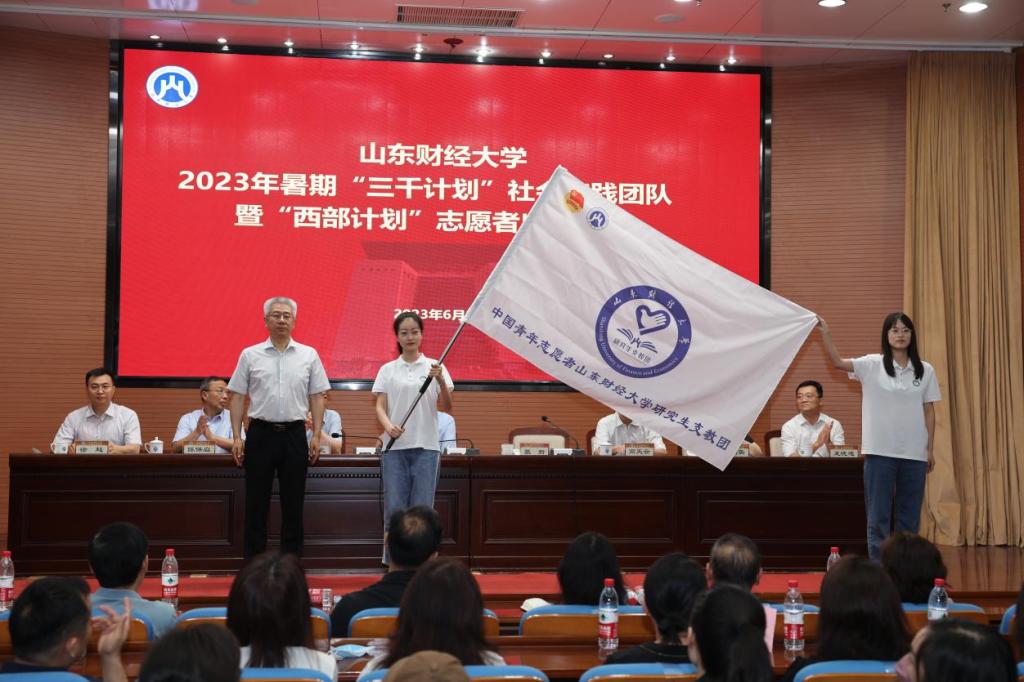 张培国为2023年“三千计划”校级重大立项团队代表授旗,张新向第25届研究生支教团代表授旗,陶虎向西部计划志愿者代表授旗。