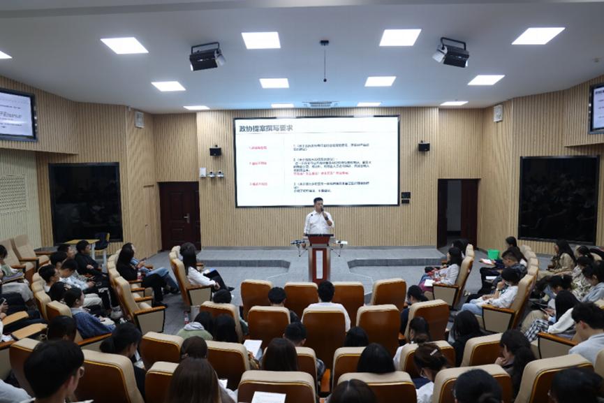 王建涛从了解政治协商制度、政协的性质和定位等方面入手,围绕政协提案“是什么、为什么、怎么写”等方面,多角度阐述政协提案的定义、性质和地位,详细说明提案的撰写要求,结合自身提案撰写经验扩点拓面地总结了如何提升提案质量。他以多个优秀提案为切入点,解答了提案立案的具体要求、提案选题的关键要点、提案撰写的注意事项等问题,鼓励同学们在提出提案过程中看本质、抓重点,发挥自身的专业与长处,根据具体实践调研,深入民众生活,了解社情民意,形成严谨、规范、有效的提案。