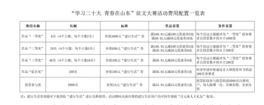 本次“学习二十大 青春在山东”征文大赛活动设置五类个人奖项,分别是作品“一等奖”、“二等奖”、“三等奖”、“提名奖”和“投票参与奖”。同时设置“优秀组织奖”,对活动期间组织推动效果突出的学院团委给予一定数额的经费支持。所有活动奖品由中国建设银行山东省分行提供,详见下表: