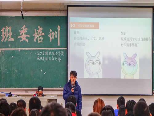 11月17日,财政税务学院2017级班委培训大会在圣井校区敏行楼圆满结束。本次培训大会由财政税务学院主办,学生会创新实践中心策划部承办。2016级优秀班委代表、2017级全体班委参加了本次培训大会。