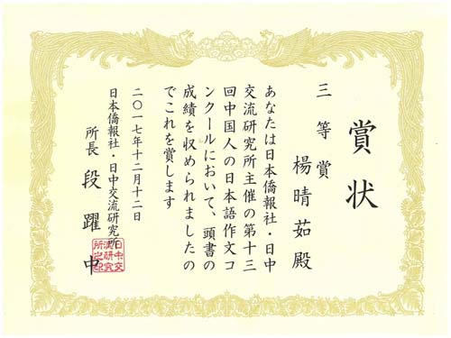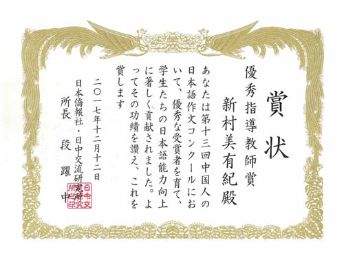 12月12日下午,由日本侨报社(中日交流研究所)和日本驻中国大使馆共同主办的“第13届中国人日语作文大赛”颁奖仪式在北京日本驻中国大使馆举行。日本驻中国大使横井裕、日本桥报社社长段跃中等为获奖者颁奖。外国语学院2014级日语1班的杨晴茹荣获三等奖,外教新村美有纪获得优秀指导教师奖。