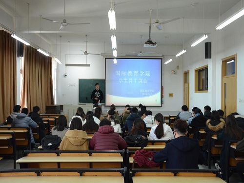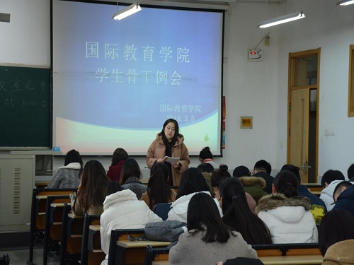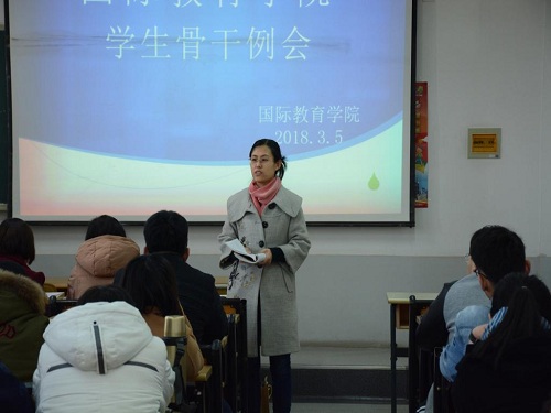 国际教育学院于2018年3月5日上午在舜耕校区召开全体学生骨干例会,院团委四位辅导员老师和全体学生骨干参加会议。会议由学生会主席杨馥瑞主持。