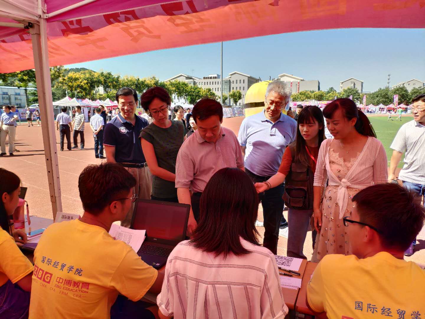 上午十时许,学校党委书记王邵军、副校长张新等学校领导在学校相关部门负责人陪同下来到迎新点,看望慰问了迎新志愿者,并在迎新帐篷前听取了学院党委书记邓迎迎关于新生报到工作的汇报,对国际经贸学院迎新工作表示肯定。