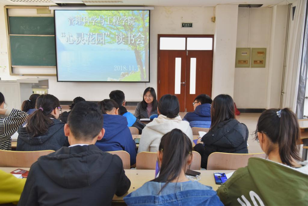 在自愿报名的基础上经过筛选,管理科学与工程学院心灵花园读书会首期共组成2个读书小组,分别由王桂月和沈健两位老师担任指导老师。在两位老师的指导下,读书会成员以书会友,利用课余时间进行学习和交流,自主开展读书活动。