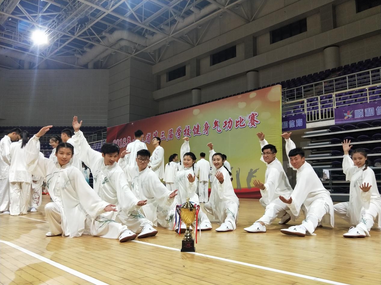 校健身气功代表队由付玉坤院长任领队,李静老师任教练,队员为体育学院的顾玉娇、郭紫强、韩双鑫、黄泳乐、孙圣、桑梓昂、王美杰、王田田8名同学。队伍从组队、学习、训练到参加比赛,克服了重重困难。赛场上他们身着白底兰花功服,姿态舒展大方、轻飘徐缓,动作刚柔并济、舒缓绵长,脚下沉着稳定、不拘不僵。队员们以扎实的专业功底和完美的表现,充分展示了我校学子的良好精神风貌。