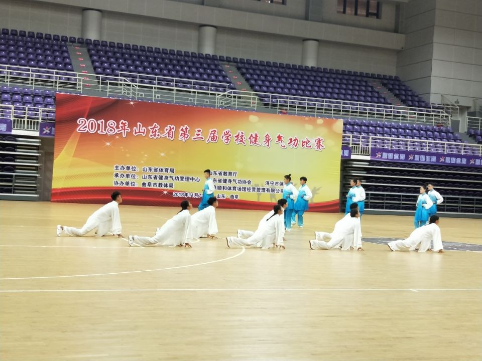 11月7日至8日,山东省第三届学校健身气功比赛在曲阜体育馆举行。在30多支参赛队中,我校代表队脱颖而出,荣获自选项目一等奖、集体易筋经项目二等奖。