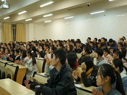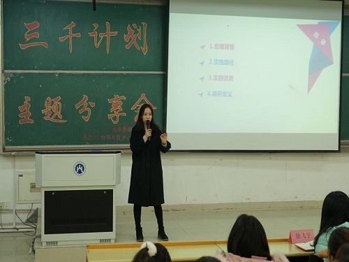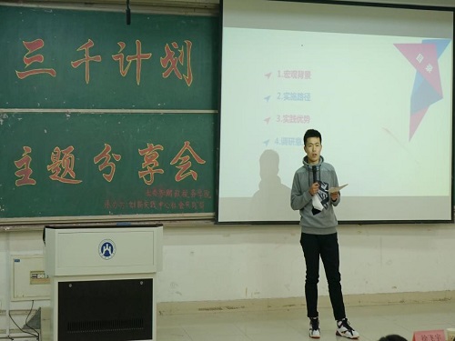 中国重汽和济南机床二厂装备制造业转型升级调研团队队长王靖童和队员孟庆昊通过幽默风趣的语言向同学们介绍了“三千计划”活动的含义和意义。王靖童认为社会实践的顺利完成离不开团队成员之间的协调与合作,团队成员应在合作中走向共赢。她建议同学们在实践过程中从大企业入手,把握机会,勇于提问,这样能收获更多。孟庆昊以“大学应该怎么‘玩’”为主题,建议同学们应该重视“三千计划”活动,并从中收获友情,提升自我,收获宝贵的实践经验。