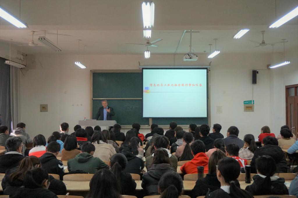 11月21日下午,副校长张新来到明水校区为我院2018级信息管理与信息系统学生上了一节生动的《信息管理与信息系统专业导论》。课上,张新以“信息化发展与专业建设成就”为主题,以从“信息化带动工业化”到“信息化与工业化融合发展”的发展历程为例,系统地介绍了信息技术在经济社会发展中所处的关键性核心性地位,以及信息管理与信息系统专业在国内外的发展情况,并着重介绍了我校在该专业建设中所取得的成就及在全省全国所处的地位。张新还通过该专业校友发展的实例,让同学们了解了自己的发展方向和前景。