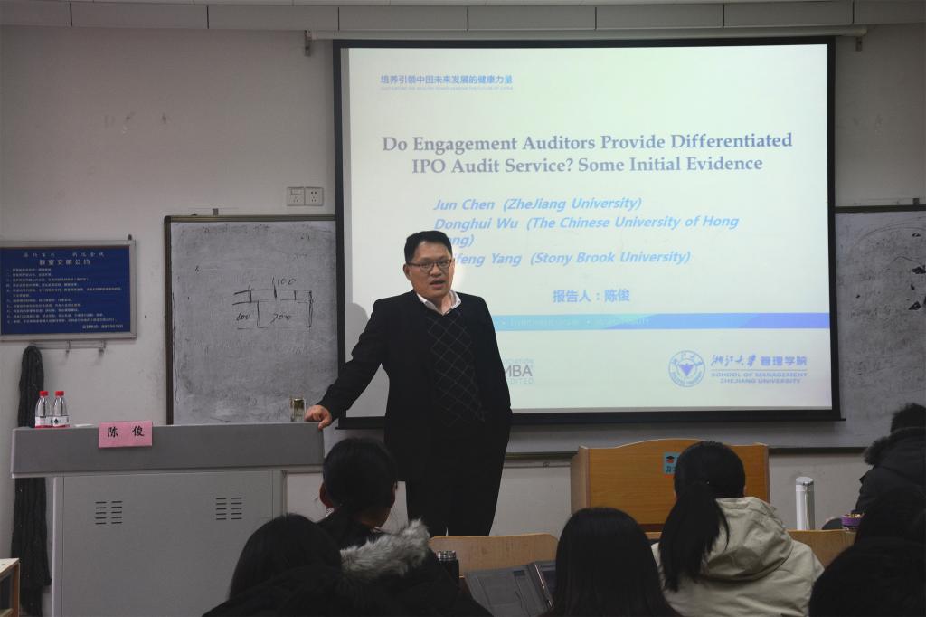 12月2日下午,浙江大学管理学院陈俊教授应会计学院邀请在燕山校区逸夫楼Y405教室作题为《Do Engagement Auditors Provide Differentiated IPO Audit Service? Some Initial Evidence》的学术报告。会计学院武恒光副教授出席并主持了报告,会计学院2018级部分硕士研究生参加了本次报告。