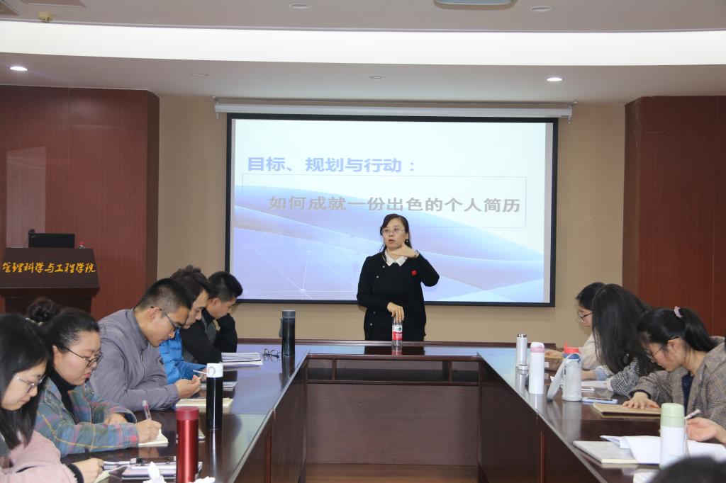 为了帮助学生做好职业规划,提升就业能力,11月30号下午,管理科学与工程学院邀请了学校法学院社会工作系主任、副教授、心理学博士陈爽做了题为“职业生涯规划和求职技巧”的讲座。本次讲座于逸夫楼Y621举行,由学院党委副书记朱翠珍主持,团委书记、辅导员何丽以及部分研究生参加了此次讲座。