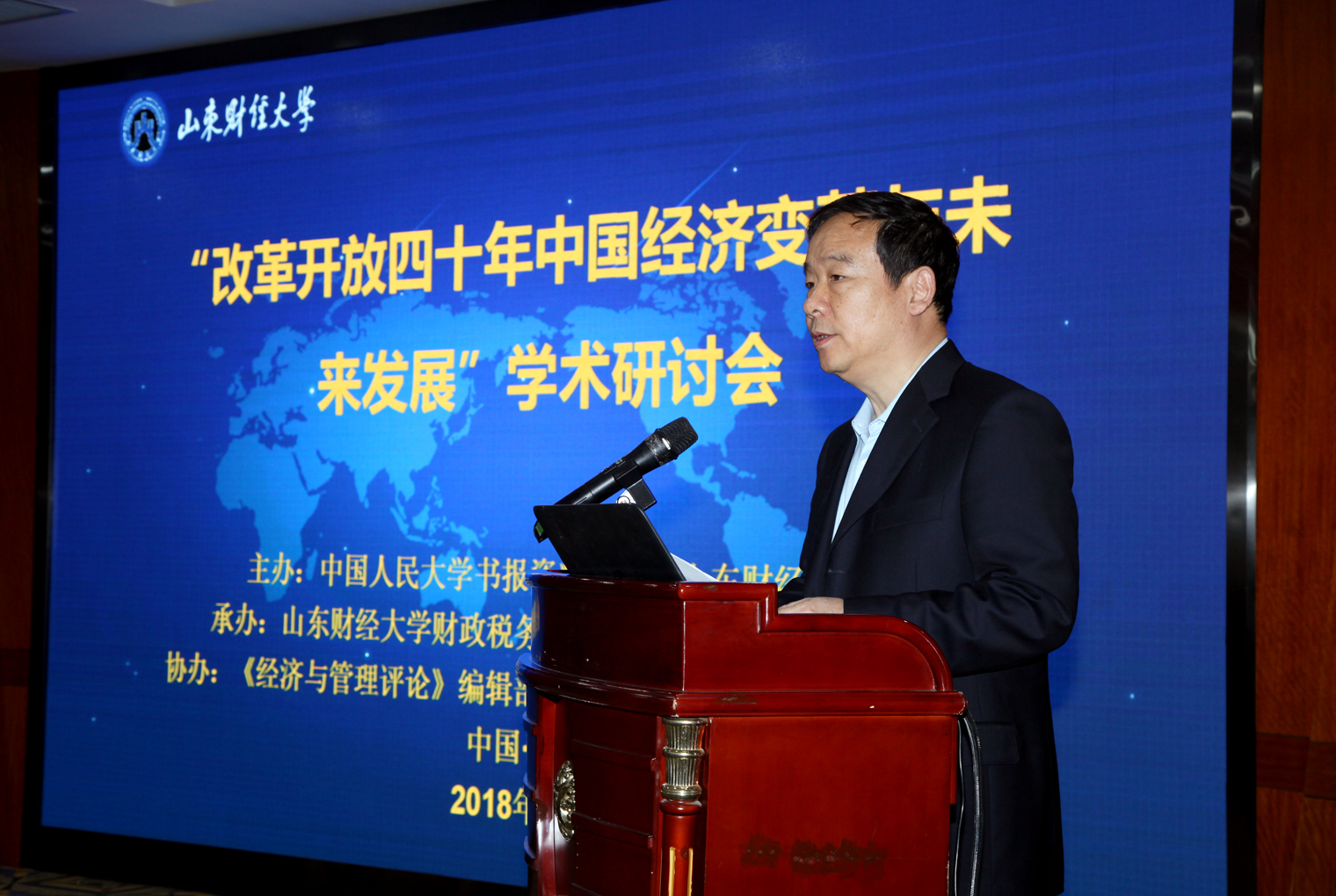 王邵军在致辞中代表学校对与会专家学者表示热烈欢迎。他强调,改革开放是我国的强国之路,是国家发展进步的活力源泉,是决定当代中国命运的关键一招,也是决定实现“两个一百年”奋斗目标、实现中华民族伟大复兴的关键一招。恰逢改革开放再出发的关键时刻,研讨会的召开具有鲜明的时代特征和现实意义。深化改革,扩大开放,需要理论工作者和实践工作者总结经验、贡献智慧、大胆探索。他期待各位专家学者能够聚焦当前经济转型中的突出问题,各抒己见,提出新观点、新举措、新思路,积极为国家和山东经济发展出谋划策,将研讨会办成推动学术创新、促进交流合作、服务经济发展的一次盛会。