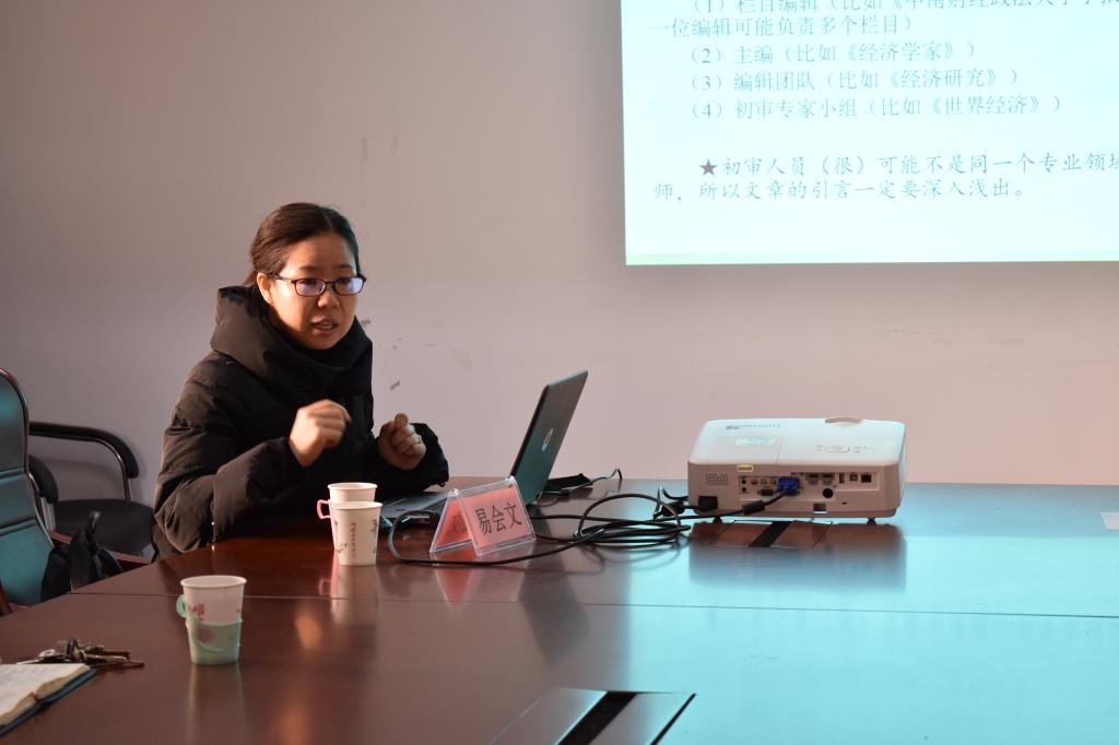 报告会中,易编审首先从编辑的角度给大家详细介绍了编辑部审稿流程中的几个环节以及投稿者需要注意的事项。她认为,在初审环节,期刊编辑所关注的重点一般包括题目与内容摘要、文章的创新性、写作规范以及学术影响力,这几个方面能否被编辑所认可直接决定了稿件能否进入外审环节。题目与内容摘要在初审环节非常重要,如果论文主题不符合本刊的刊发领域,该论文就很难通过初审环节。而如何找到一本杂志的关注点,易编审建议大家持续跟踪该期刊的每年总目录。对于论文的创新,编辑们一般关注是否有创新、创新有多大以及是哪种类型创新,通过对论文文献述评以及参考文献的观察,编辑们还是比较容易能发现创新的真实性的。而对于写作规范如框架是否完整、逻辑是否顺畅、格式是否规范等,这些细节决定了作者的态度,也是编辑们重点关注的内容。在评审环节,易编审还结合《中南财经政法大学学报》自身的做法介绍了评审专家的选取来源,主要是在权威期刊上发表过论文的学者以及具有相同研究领域和相同研究风格的学者等。