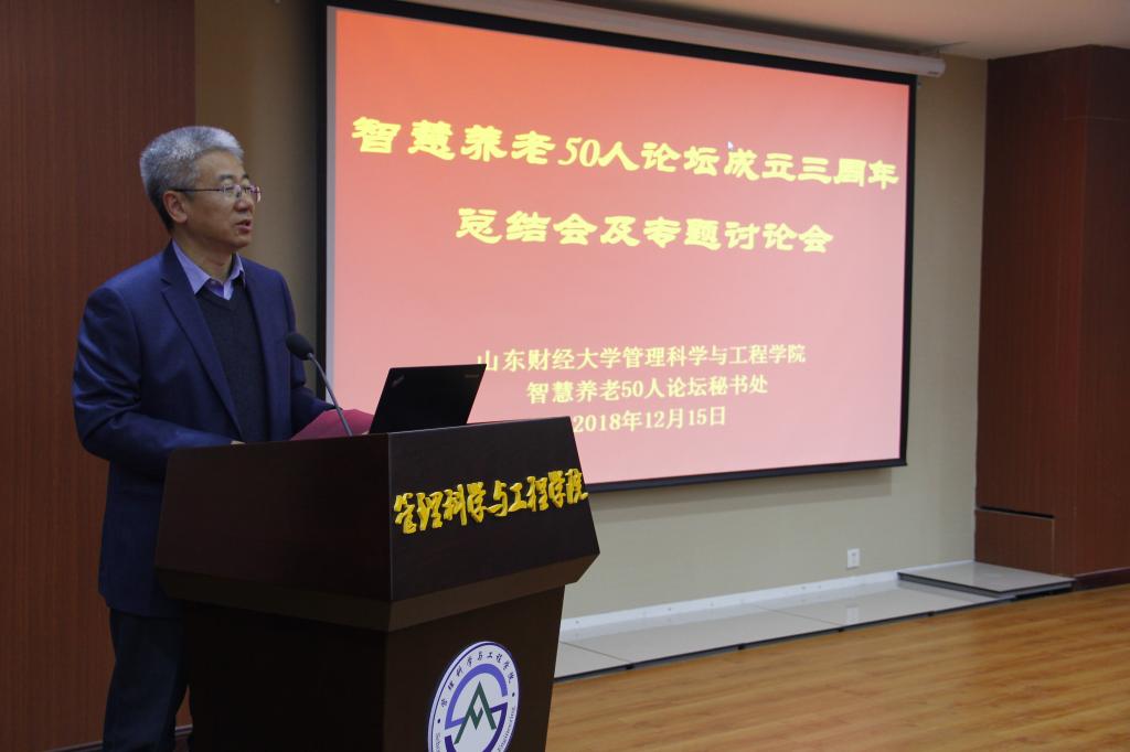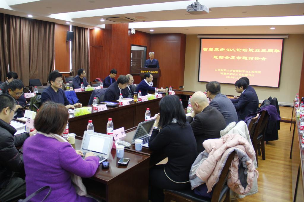 2018年12月14-15日,“智慧养老50人论坛”在山东财经大学隆重召开,本次论坛由管理科学与工程学院承办。论坛围绕中国智慧养老的发展问题,聚焦“智慧养老与智慧医养课程体系建设、智慧养老与智慧医养项目评估、智慧养老三年来进展回顾”等三个主题进行了深入讨论与交流。我校副校长、论坛轮值主席张新、中国人民大学智慧养老研究所研究员褚晓峰共同主持了本次论坛报告。论坛成员、企业代表、管理科学与工程学院师生50余人参加了此次会议。