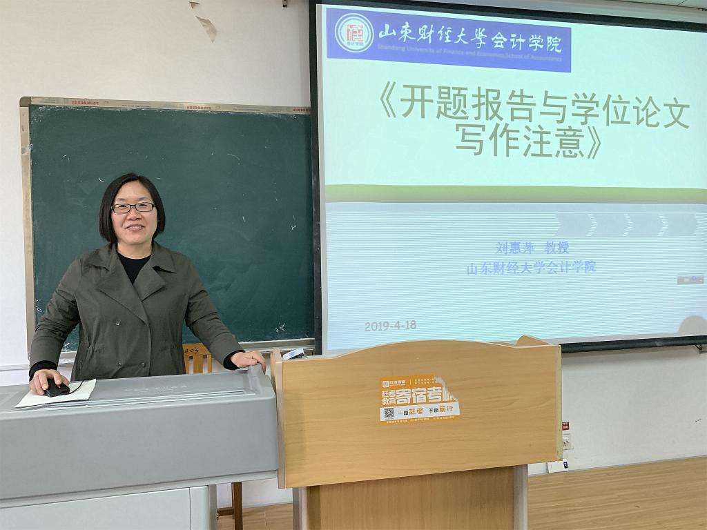 4月18日下午,会计学院研究生开题与论文写作规范讲座于逸夫楼Y403和Y308开讲。本次讲座邀请了我院刘惠萍教授和李秀玉副教授分别为2018级专业学位研究生和2017级学术学位研究生进行毕业论文开题写作指导。