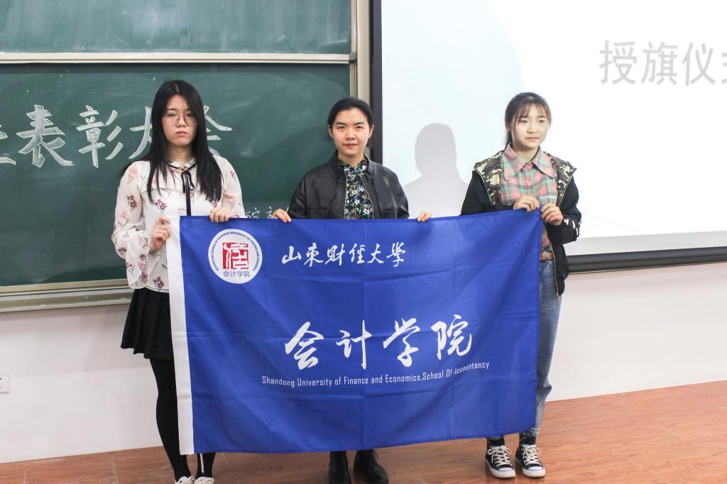 在同学们热烈的掌声中,张慧娟为学生代表授旗,会计学院2019年“三千计划”正式启动。
