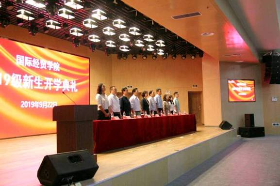 典礼开始,2019级全体新生及在场领导共同唱响国歌,表达了对祖国的热爱。首先,王庭东教授介绍了国际经贸学院国际经济与贸易、国际商务、贸易经济3个专业各自的人才培养计划,重点强调了计算机编程和大数据分析对国贸专业的重要意义,并向大家展望了国际经贸学院各个专业未来发展的方向,帮助大家树立了专业学习的信心。接着,优秀教师代表张绍辉发言,指出经济学的地位,向大家阐明了“经世济民”的学科内涵,教育大家要丰富自己的人文素养,培养自己的道德品质,努力使自己的专业成为造福社会的有效工具,激励新生从课堂到社会都要保持积极向上的态度。随后,老生代表和新生代表分别发言,对大学生活进行了总结和展望。典礼最后,党委书记邓迎迎对新生提了3点要求。其一,新生要重新理解学习的含义,大学生的学习不再是为了考试,而是为了追求成长。二,要学会加强锻炼来进行自我管理。三,对自己要有准确的认识。