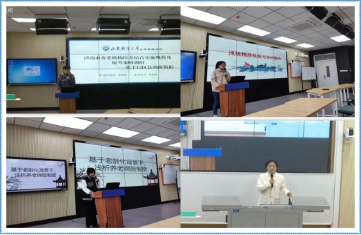 最后一次同步课堂则是完全由两方同学们承担,通过同学们的汇报交流,实现“以生为主”翻转课堂的教学方式。公共管理学院学生做了《济南市医养结合实施现状及提升策——基于12区县调研数据》《浅谈精准扶贫与乡村振兴》《基于老龄化背景下,浅析养老保险制度》三个报告,塔里木大学的学生做了《社区+居家智慧养老服务计划》《女性就业权益保障一生育假期》两个报告。学生们从自己实践调研中的发现、自己关心的社会保障相关内容等不同的角度,为两校学生呈现了精彩一课。