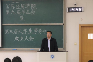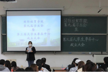 随后,大学生事务中心代表姚奕欣同学发言。她在发言中介绍了国际经贸学院大学生事务中心的宗旨“立足学院,为学生服务”,并详细介绍了纪检部、卫生部、学习部等十个部门的具体职能。回首过去,大学生事务中心尽职尽责,担任服务老师与学生纽带的重要职责。面向未来,大学生事务中心信心百倍,继续努力成为让学院领导、老师放心,让同学们满意的学生组织!