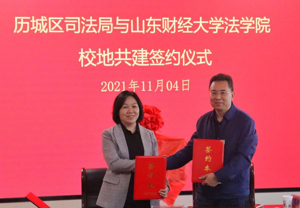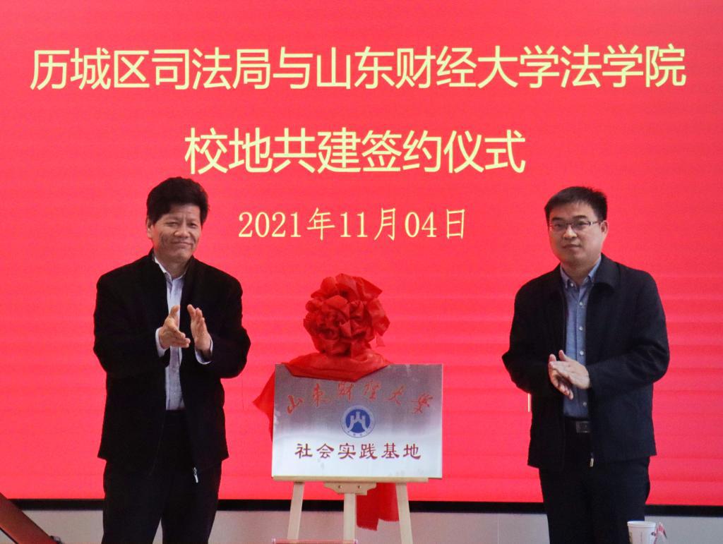 赵世民与历城区司法局党组副书记、副局长董瑞签订“校地共建协议”。谷学峰与王东共同为“山东财经大学社会实践基地”揭牌。
