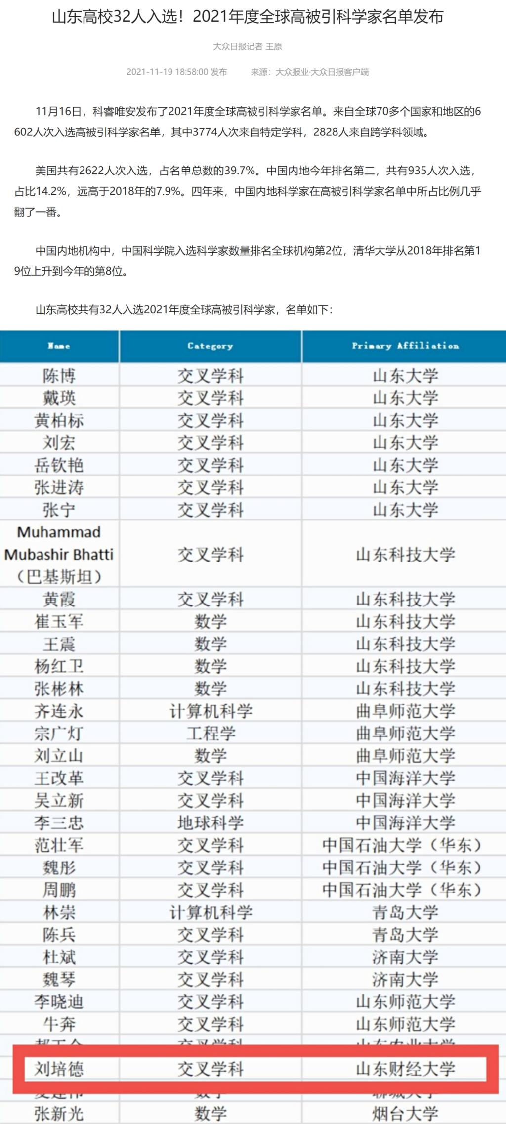据悉,该名单遴选是科睿唯安基于WOS(Web of Science)中SCI论文的发表数量和引文客观数据,精选出过去十年发表高被引论文(即在同年度同学科领域中引文影响力排在前1%的论文)的科研学者,展现出某学科领域中的科研人员所取得的科研成果受到全球同行的集体认可以及影响力。此次全球70多个国家和地区的6602人入选该榜单。2021年,中国内地仍为第二大“高被引科学家”所在地区,共有935人入选。山东高校共有32人入选2021年度全球高被引科学家。