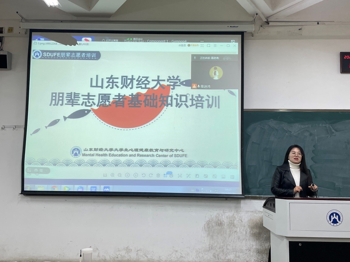 为普及心理健康知识,促进校园朋辈互助,11月26日下午金融学院于舜耕校区6116教室举办了朋辈志愿者培训讲座。讲座由辅导员徐洁老师主讲,研究生新生朋辈志愿者及心理委员参加线下培训,其余同学线上参与。
