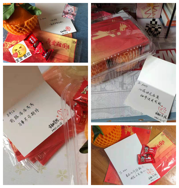 12月14日,金融学院的研究生志愿者们仔细地为每一位毕业生制作好惊喜礼包。脆嫩的橙子寄语毕业生心想事“橙”,马到“橙”功;“旺仔”糖果祝福毕业生来年一定“旺”;一抹中国红的口罩更是在这个特殊的时节给予毕业生最真挚的“幸运色”。毕业班辅导员陈静、陈玉林早早地来到办公室,在卡片上写下祝福。“星光不问赶路人,时光不负有心人”、“万事都要全力,包括开心”、“一‘研’为定,一起成为更好的人”、“纵有疾风起,人生不言弃”……一笔一画,皆是深情;一卡一纸,满满真意。将这冬日的暖阳通过笔触传递到学生心间,为毕业生送去温暖和关怀,为他们求职和考研鼓劲加油。