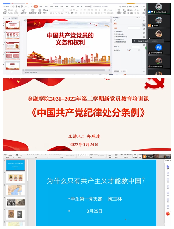 按照金融学院党员教育培养工作安排,提升新党员的党性修养,3月21日至27日,金融学院开展2021-2022学年第二学期新党员教育培训工作,金融学院分党校组织专职组织员、各党支部书记等进行线上授课,全体新党员参加了培训。