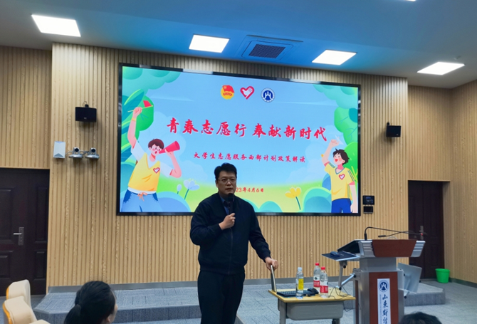 4月6日下午,由校团委和就业指导处主办,共青团新闻中心承办的“以青春之名 赴西部之约”2023年西部计划月系列讲座首期在燕山校区举办,山东省志愿者行动指导中心领导、大学生志愿服务西部计划山东省项目负责人魏华作了题为《青春志愿行 奉献新时代——大学生志愿服务西部计划政策解读》的专题讲座,此次讲座纳入2022年山东财经大学“青马工程”大学生骨干班培训课程。校团委书记王晓迪、就业指导处副处长何峰、各学院就业办主任、部分应届毕业生和“青马工程”大学生骨干培训班学员参加本次活动。活动由校团委副书记邢夏子主持。