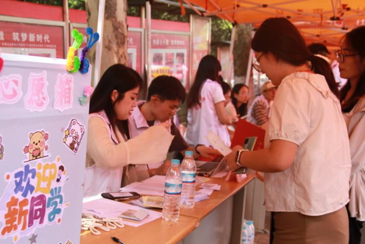 在迎新现场,陆续到达的新同学们受到学长学姐们的热情迎接,感受到国际经贸学院大家庭的温暖。迎新现场,虽然已是9月,但天气依旧炎热,而志愿者们不惧炎热的天气,有条不紊地帮助新生办理入学手续。他们有的在迎新点处统计基本信息、发放新生礼包,有的帮助新生将行李运往宿舍,用心周到的服务让新同学们倍感亲切。国际经贸学院特意为新生准备了“时光邮筒”“心愿箱”,引导新同学在迎新现场写下自己的美好心愿。另外,迎新点附近的展板则为新生们详细地介绍了学院概况、学科建设、学团工作、毕业生去向等内容,让他们对国际经贸学院和所学专业有着进一步了解。此外,国际经贸学院还为新生精心设计了T恤、卡套、贴纸等文创礼物,让新生切身感受到国际经贸学院的关爱和文化风采。