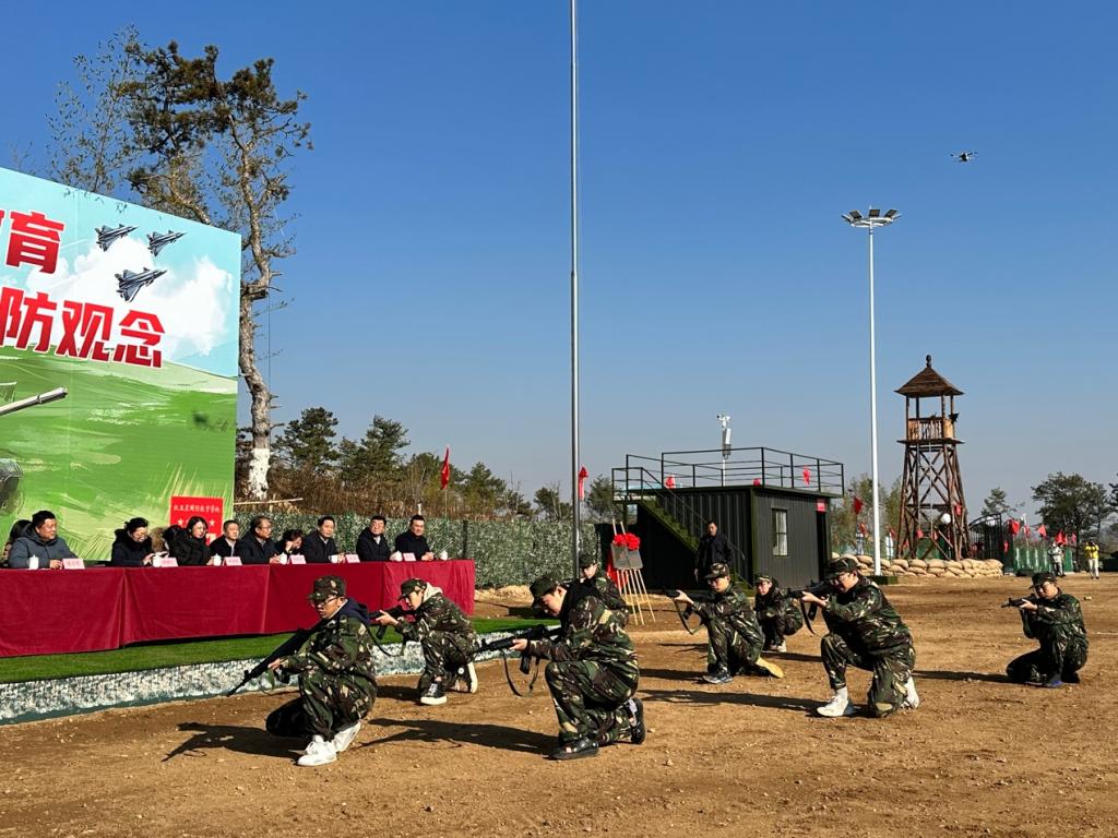 揭牌仪式结束后,董方军下达军事表演指令。在教官的指挥下,身着迷彩服、英姿飒爽的参训学生开展了队列动作、战术合成、模拟射击、战车演训四个表演项目。同学们不畏寒冷、斗志昂扬,展现出新时代大学生良好的精神面貌和军事素质。