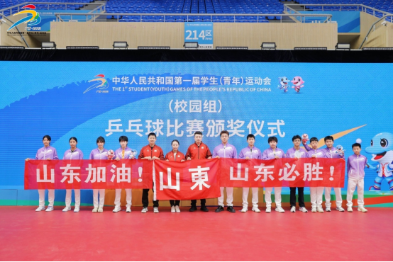 11月12日,中华人民共和国第一届学生(青年)运动会(校园组)乒乓球项目决赛在广西省玉林市博白县体育中心圆满落下帷幕。本次比赛由教育部、国家体育总局、中国共产主义青年团联合主办,广西壮族自治区人民政府承办,吸引来自全国38支代表队的232名优秀学子走进魅力博白,展示青春风采,追逐荣誉梦想。本次比赛得到了山东省教育厅的高度重视,我校体育学院负责乒乓球项目的组队和备战参赛工作。根据备战需要,体育学院自3月份开始组织了选拔赛以及多次集训,参加了预赛并顺利闯进决赛阶段。经过七天激烈争夺,山东队获得一枚银牌和多项前八的优异成绩,队伍获评体育道德风尚奖。
