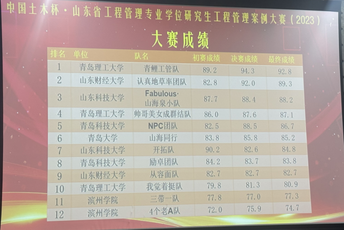 2023年11月25日,山东省工程管理专业学位研究生工程管理案例大赛决赛在青岛理工大学(黄岛校区)圆满落幕,管理科学与工程学院王睿副教授和闻思源副教授指导的“认真的草率”团队(成员:张家逸、孔唯甲、孔晓、徐曼、李思宇)和孙国华教授指导的“从容地面”团队(成员:马雅如、刘晓耀、闫世秋、张娜、张昆)在此次大赛中分别荣获一等奖和三等奖。王睿和闻思源老师获大赛优秀指导教师。
