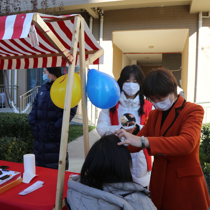 上午9:30,活动正式开始,志愿者们坚守在自己负责的岗位上。爱心义诊区,志愿者们向居民科普检查注意事项、引导现场排队秩序,助力义诊活动高效平稳的推进。便民服务区,志愿者们协助进行公益理发、磨刀、缝补衣服、心理健康咨询、闲置物品互换等活动,了解居民生活需求,耐心帮助居民解决问题,为居民的日常生活带来落到实处的帮助。创意社交区,志愿者们协助介绍毛毡帽子、蜡烛、捕梦网的制作过程,引导社区居民前来体验手工艺术的魅力,为传承手工艺术贡献青年力量。