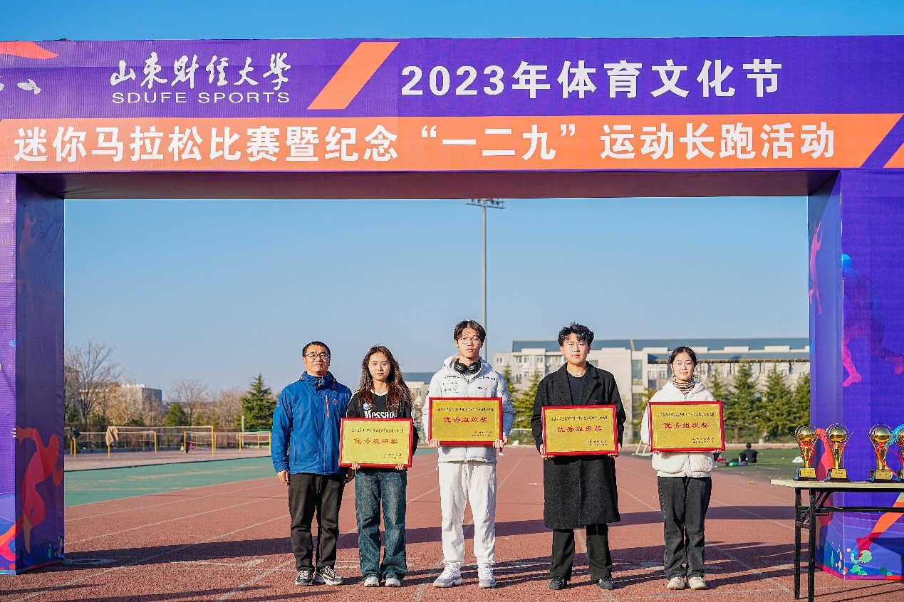 12月7日,我校2023年体育文化节迷你马拉松比赛在圣井校区顺利举行。本次比赛由校学生工作部、校团委、教务处、体育学院主办,迷你马拉松竞赛组、校学生会协办。校团委副书记邢夏子、体育学院副院长韩夫苓到现场为获奖学院颁奖。