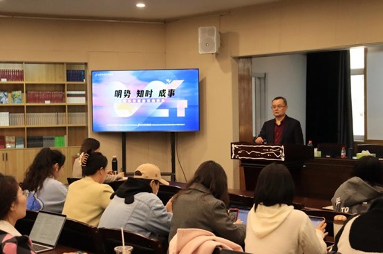 3月21日“新闻传播学前沿系列”讲座第三期在文学与新闻传播学院诗学研究中心诗学中心举行。山东文旅传媒集团董事长、《山东商报》社长、高级编辑庞道峰老师为文学与新闻传播学院师生作题为“明势、知时、成事——文旅与传媒的双向奔赴”的演讲。讲座由文学与新闻传播学院新闻系主任郑燕教授主持,新闻系部分教师和新闻传播专业全体研究生参加本次会议。