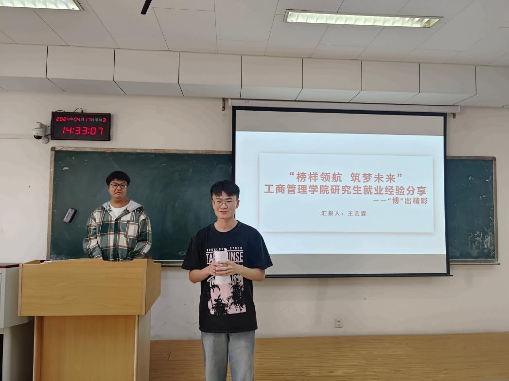 为不断提高学院研究生培养质量,提高同学们的学术素养,鼓励同学们继续深造。工商管理学院于4月17日下午在逸夫楼202举行“榜样领航助力未来”为主题的研究生就业经验分享会一:“博”出精彩。本次活动邀请了已被上海财经大学拟录取的2021级企业管理硕士研究生王艺霖主讲,会议由研究生会主席曹炳凯主持,研一、研二全体研究生参加。