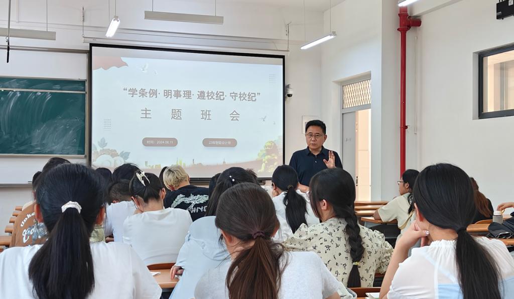 2024年6月11日,会计学院党委书记邵文涛在23级智能会计班,召开“学条例·明事理·遵校规·守校纪”主题教育班会。