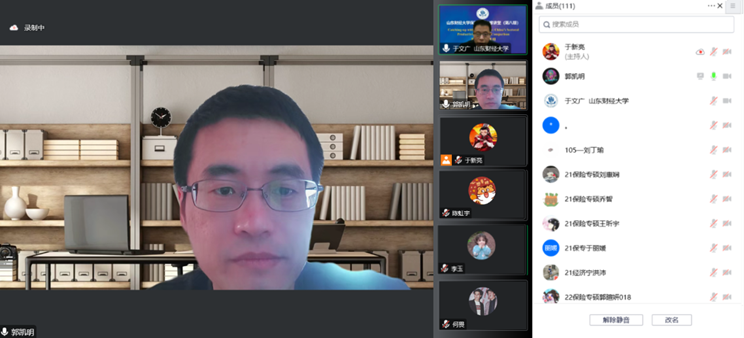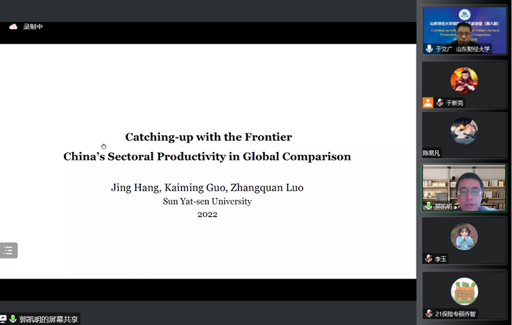 12月8日下午15:00,我校保险学院第八期名家讲堂成功举办。本期名家讲堂特邀中山大学岭南学院郭凯明副教授做主题为“Catching-up with the Frontier: China’s Sectoral Productivity in Global Comparison”的报告。讲座由我校保险学院院长于文广教授主持,学院老师、本科生和硕博研究生,以及校外人员等110余人线上参与。