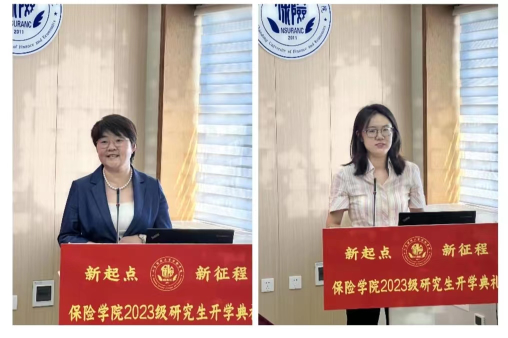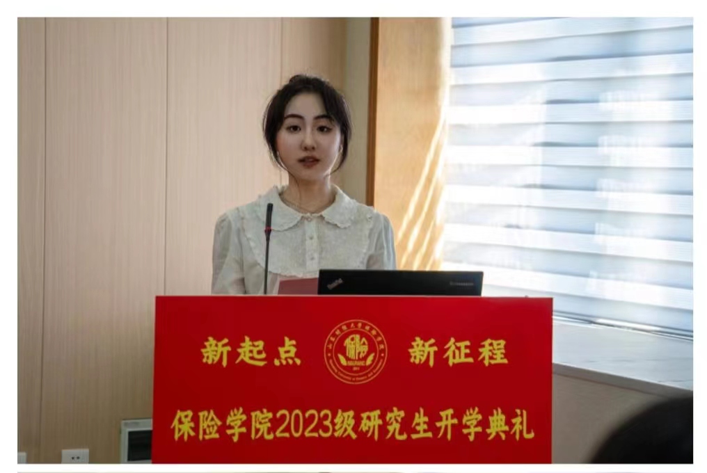 2021级学硕张程荷作为在校生代表分享了研究生学习经验以及申请博士、考公务员、求职等方面建议,为新生送上真诚祝福。2023级保险专硕单一悦作为新生代表进行发言,回顾了自己在保险学院的四年本科期间所真切感受到的“保险一家亲”的温暖以及学院的快速发展,表达了对未来读研之旅中追求知识和自我成长的美好憧憬与期待。