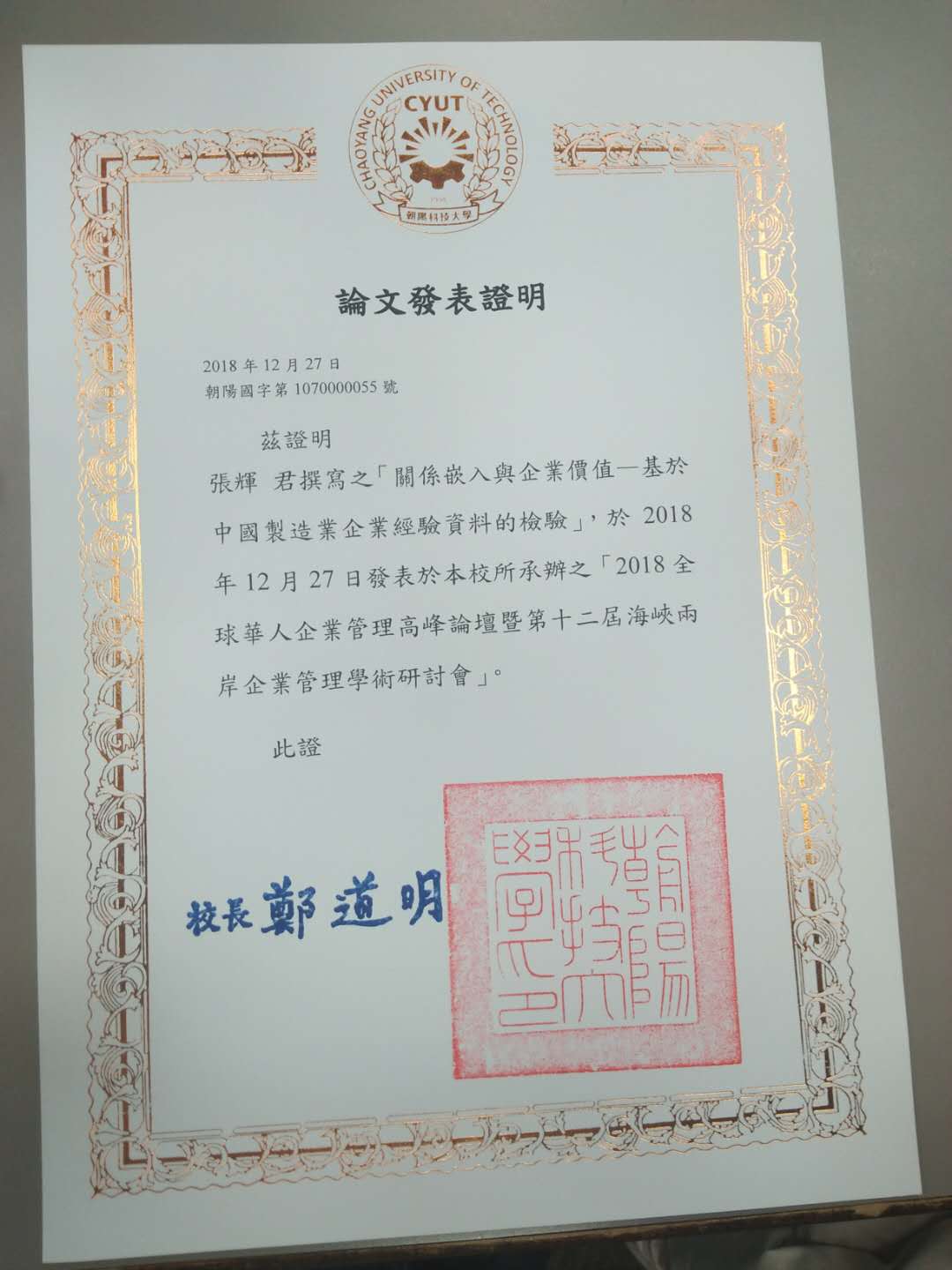 张辉同学于2018年12月26日-30日赴中国台湾朝阳科技大学参加“2018全球华人企业管理高峰论坛”,该论坛每年举办一次,是海峡两岸重要的学术沟通平台。本次论坛的主题是“智慧时代的企业创新”,分设了创新模式、组织创新与人资管理、行销管理、流通管理、金融科技、休闲管理、旅游管理、东方管理、电商管理、科技管理及其它有关议题。交流会上,张辉同学就申请并参加的山东财经大学“2018年博士研究生海外研修计划”进行了介绍。此外,张辉同学重点从“学术交流”和“企业参观”两个方面对本次论坛的主要内容进行了讲解,其中,“学术交流”主要包括本次论坛的分类主题和发表的论文,“企业参观”主要围绕台中地区四家典型企业的特征及运营模式进行分享。