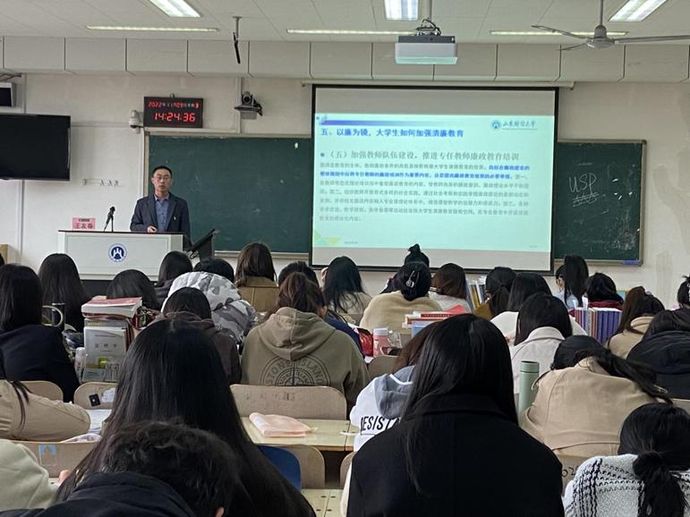 首先,王友春围绕大学生清廉教育的现实问题与挑战,结合具体案例,深入剖析了新时代大学生清廉教育的重要性,从国际国内廉政形势、廉洁教育的内涵、大学生廉洁教育的行为规范等方面进行系统讲解,引导学生要以廉为镜,认清廉洁修身的盲区,形成诚实守信、正直节约、崇廉拒腐的价值观;随后,张红霞以“厚植青廉底蕴 赋能成长成才”为题,带领全体学生学习了习近平总书记关于青年学生成长成才的重要思想,从青年学生的理想信念、价值取向、知识学习、意志品质、思维能力、创新精神、社会实践、使命担当等八个方面进行讲述,帮助学生充分认清形势、守住底线,进一步增强了学生的廉洁自律意识。