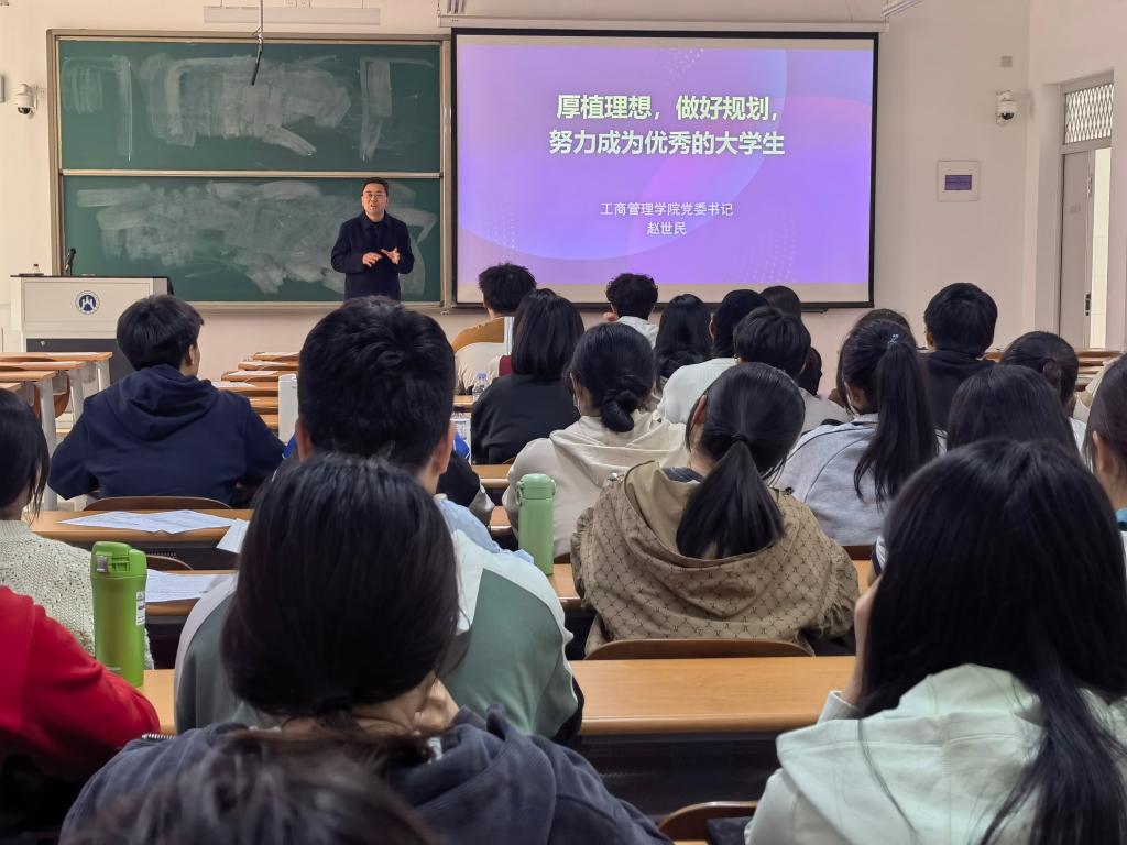 3月7日下午,工商管理学院党委书记赵世民在圣井校区8110教室为2022级工商管理类9班、10班同学上了一堂以“厚植理想,做好规划,努力成为优秀的大学生”为主题的班会。