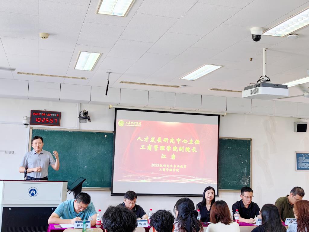 最后,人才发展研究中心主任、副院长江岩致辞,他向2023级研究生新生们提出以下三点建议:一是要有目标引领,在学习和生活中树立明确的目标;二是要有行动的智慧,面对自己能控制的事情要积极行动;三是建立自己的专业优势,学习中要注意梳理管理学学术发展脉络以及注重理论和实践的融合。