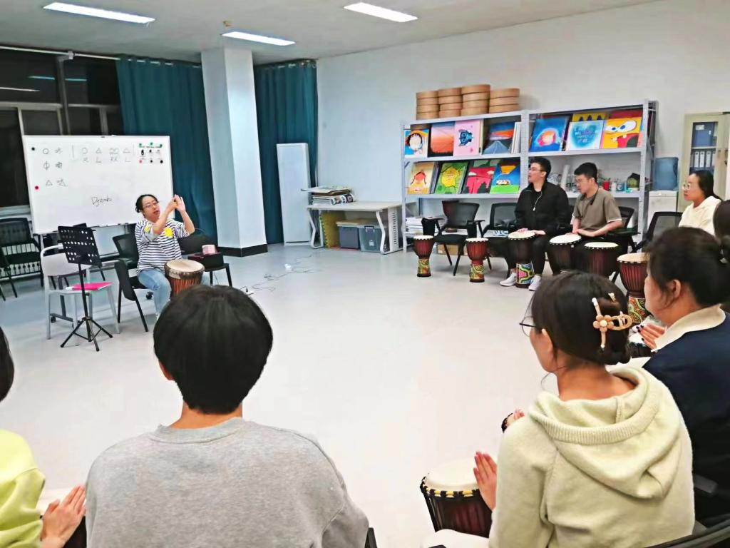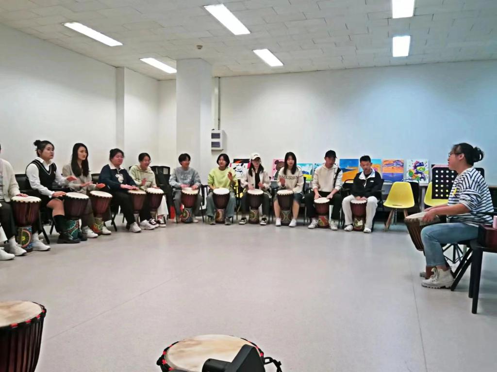 在了解非洲鼓后,孙丽老师演绎了歌曲《处处吻》,展示了打击非洲鼓基本的手法和节奏韵律。之后选取歌曲《远走高飞》和《安和桥》开启教学之旅,伴随着音乐和鼓声的超强节奏,同学们逐渐开始释放自我,完全沉浸于这激情悠扬的音乐氛围之中,着实体验了一场心灵的疗愈之旅。